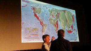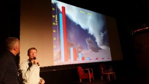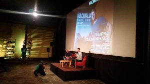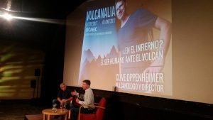 El miércoles, disfrutamos mucho con Floriane Chouraqui, viendo «Fogo na boca», se nos puso un nudo en el estómago con «El valle sin sombra», el jueves nos asombró «Montañas ardientes que vomitan fuego» y finalmente «Into the inferno» de Werner Herzog, nos dejó con la boca abierta. La cinta vino a Tenerife y pudo ser visionada gracias a la generosidad de su protagonista y asesor científico, el profesor de volcanología de la Universidad de Cambridge, Clive Oppenheimer y al gran trabajo con los subtítulos del equipo del FICMEC. La noticia de que se habían agotado las entradas fue un buen augurio. Cuando terminó el documental el público asistente, tuvo la oportunidad de preguntar a Clive y estuvimos allí hasta que fue posible hablando de volcanes y hombres. Nos quedamos con el buen sabor de boca de escuchar y compartir buenos momentos con un verdadero sabio, humilde y siempre dispuesto a compartir sus conocimientos.